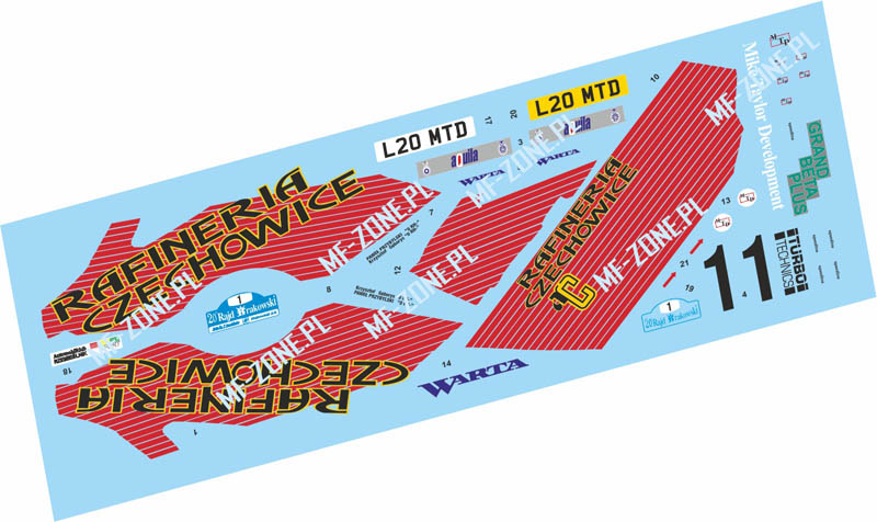 Kalkomania drukowana metodą cyfrową łącznie z kolorem białym i metalicznymi. Drukowane jako całość. Poszczególne loga i napisy nie są odseparowane od całości.